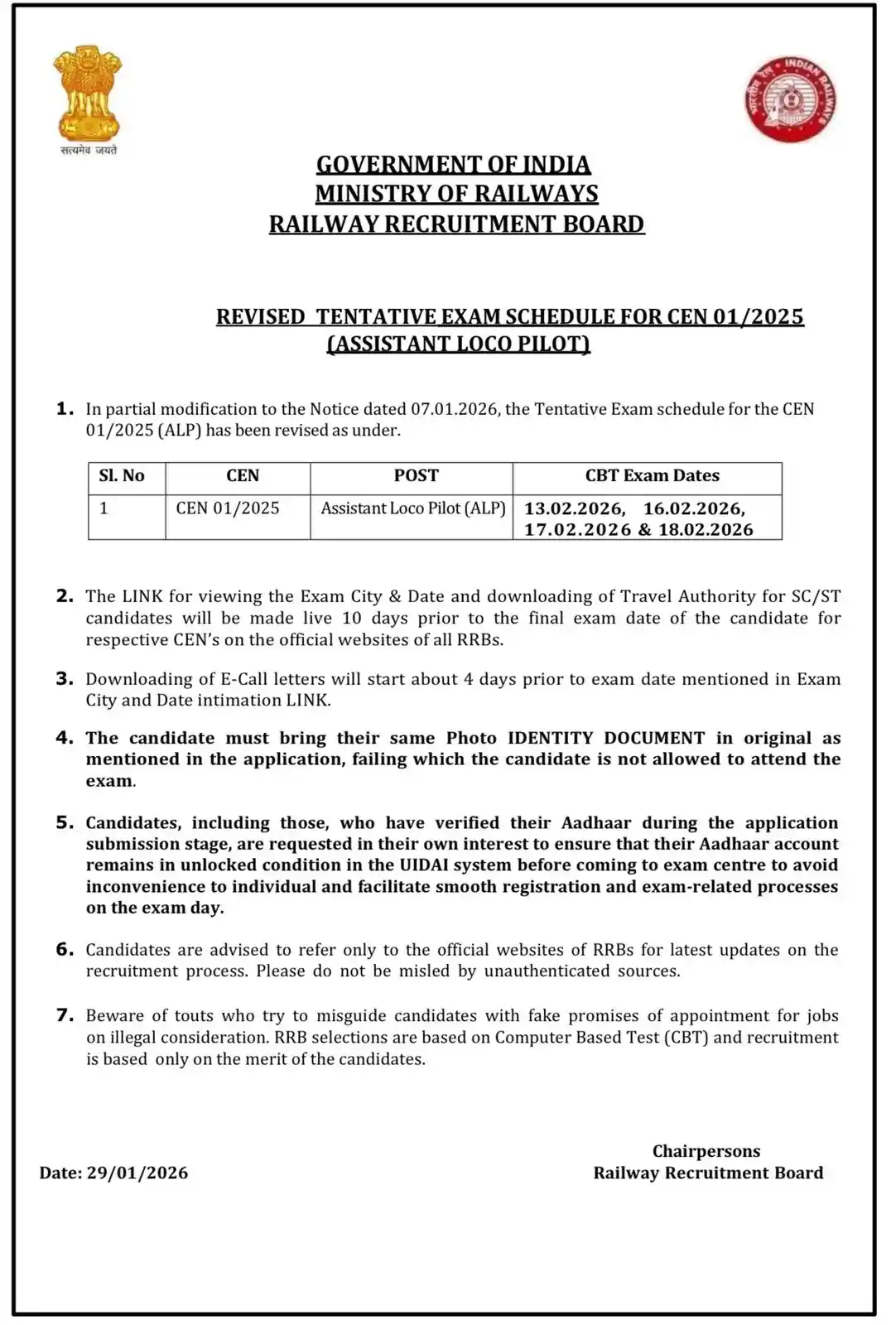 | RRB ALP CBT Exam Date | 13, 16, 17 and 18 February 2026 (Revised Exam Date) |